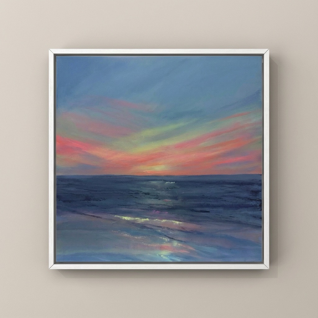 Sometimes a painting starts as nothing more than a moment you wish you’d bottled. This one came from standing on a beach long after everyone else had gone home, when the sky does that strange, generous thing — throwing out colours you didn’t even notice creeping in. The sea was barely moving, just enough to catch the light and smear it across the wet sand.